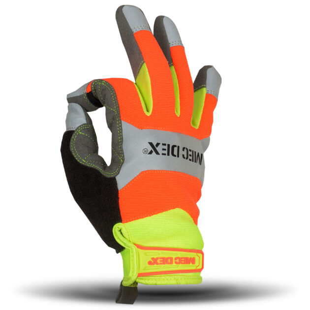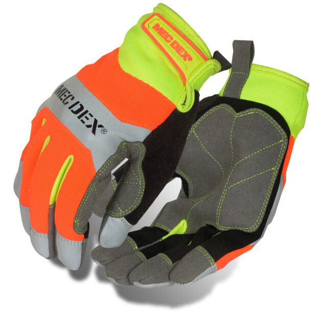The high performance visibility glove. A tough form-fitting glove designed to handle all of your challenging tasks where visibility is necessary. Durable synthetic leather base palm with reinforced palm patch, finger tips and crotch. 2 tone hi viz unlined spandex fabric backing. Stretchable reflective tape knuckle & finger tips. Soft vinyl easy hook & loop closure. Vintage synthetic leather puller on front cuff that makes your gloves easy to pull on. Micro terry towel on thumb back for convenience to absorb sweat.