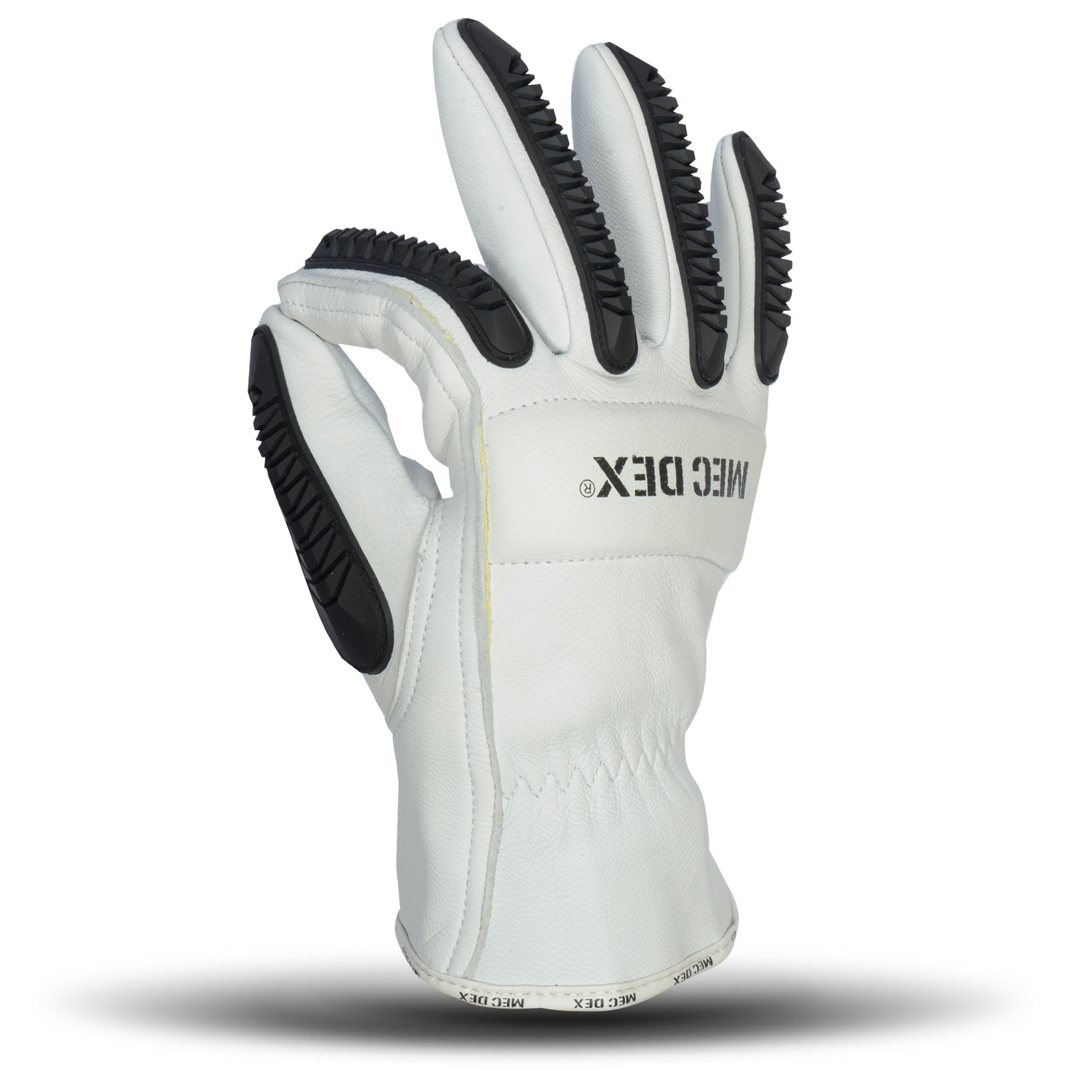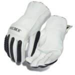The best part of this glove is its EN CUT level 5 protected palm with HSP 60/40 Long Staple aramid fabric layer under the crust Goat Skin leather palm & front thumb with enhanced tensile, abrasion and grip performance along its light weight hand feel. This leather gloves version along cut property is suitable to handle any job which has cut hazard. Gloves stitching construction is made up of polyester thread in its unique pattern formulating a keystone thumb and gun cut middle finger which is a durable part of this glove. Back of finger having stitched vinyl finger TPR & gel padded knuckle provide protection against impact.